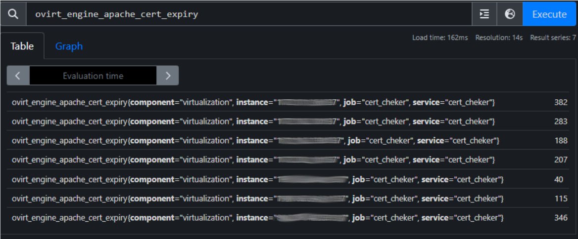 Для решения этой задачи мы разработали специализированный экспортер — cert_checker, размещаемый непосредственно на каждом oVirt Engine в каталоге /opt/cert_checker. Для тех, кто не знает, oVirt Engine — это центральный сервер управления, который контролирует все ноды виртуализации, общие дисковые ресурсы и виртуальные сети.