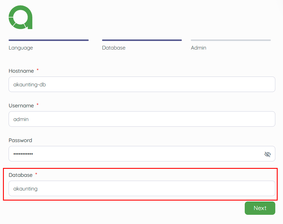 Параметры базы данных можно посмотреть в docker-compose конфигурации в /opt/akaunting