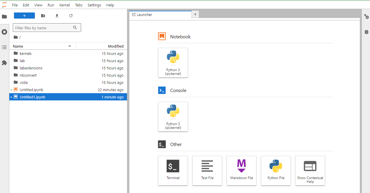 - Стандартное меню с опциями: File, Edit, View, Run, Kernel, Tabs, Settings, Help.