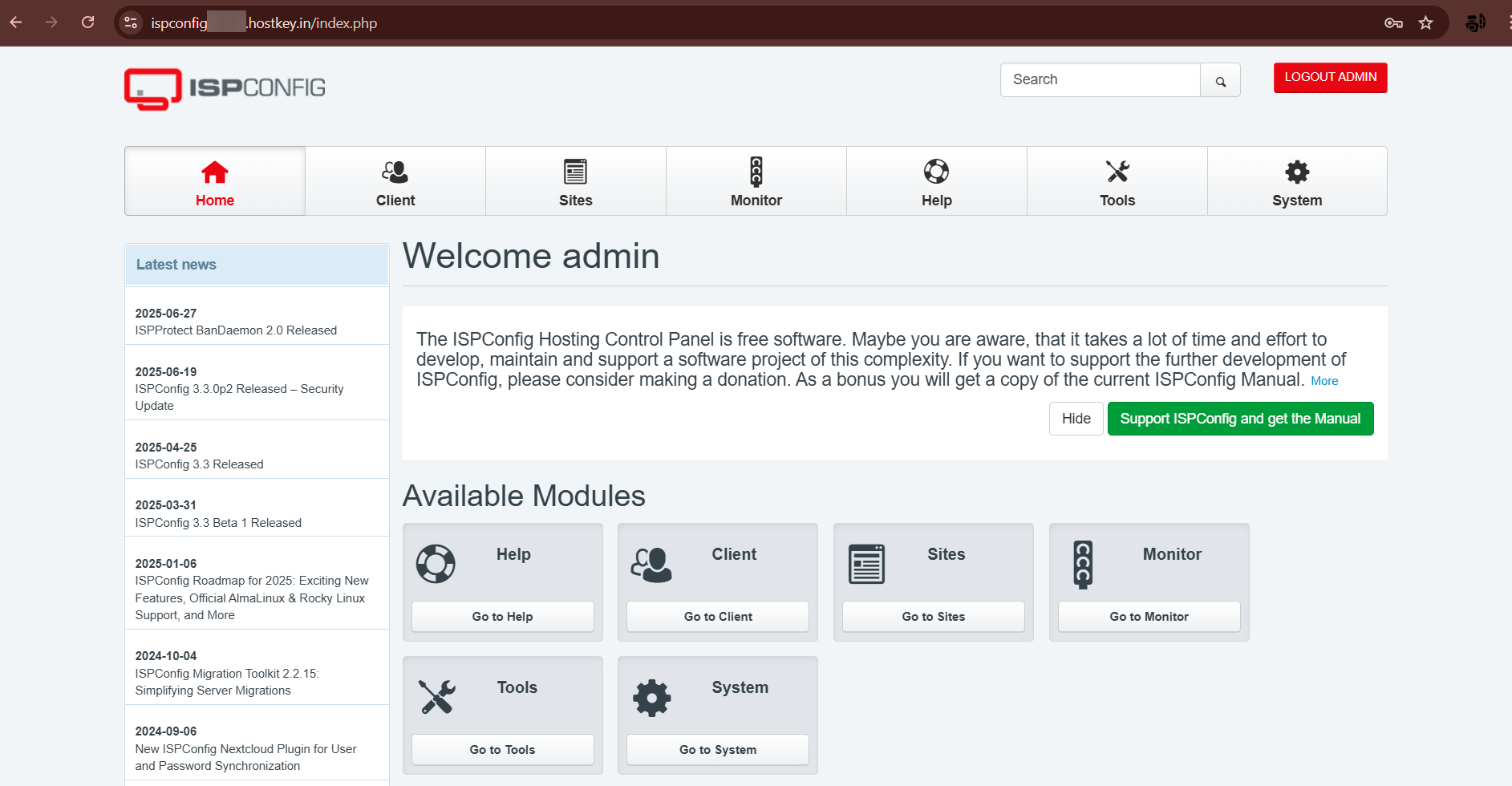 Боковая панель Latest news отображает последние новости о разработке ISPConfig: