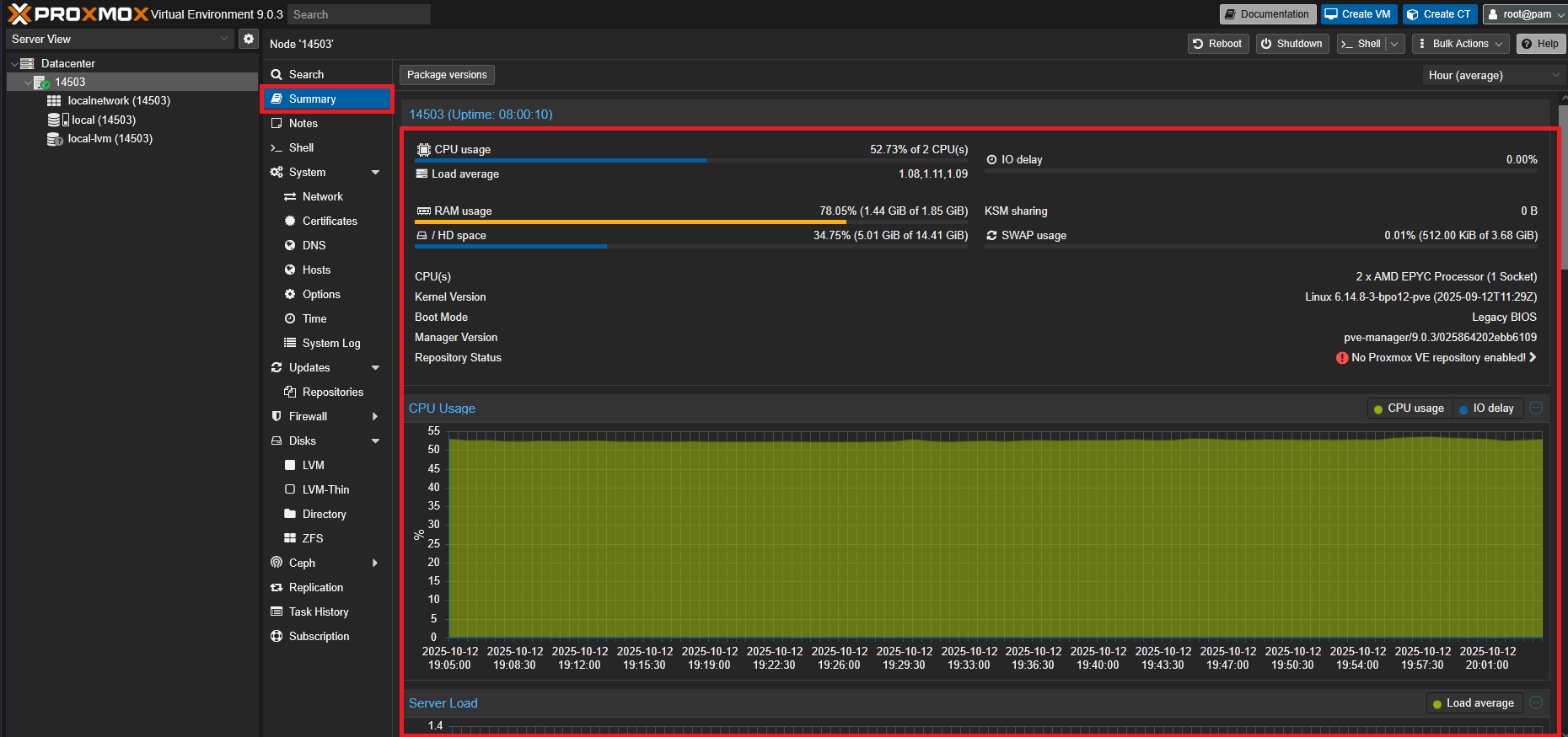 Перейдите: Datacenter → Node → Summary - проверьте CPU, RAM, диски, аптайм: