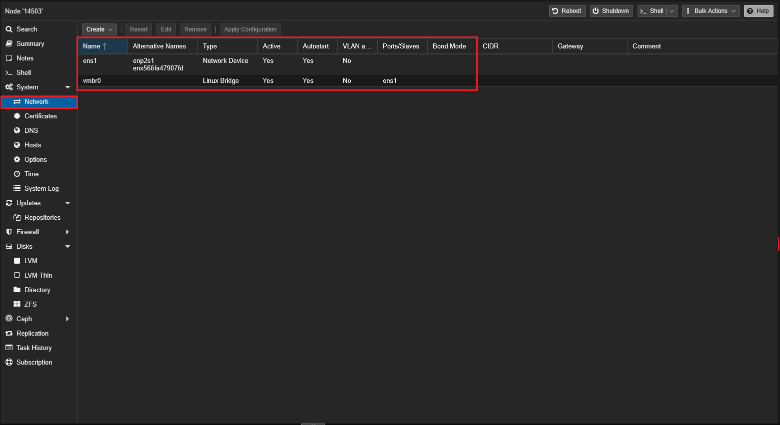 Create→Linux Bridge:- Name: