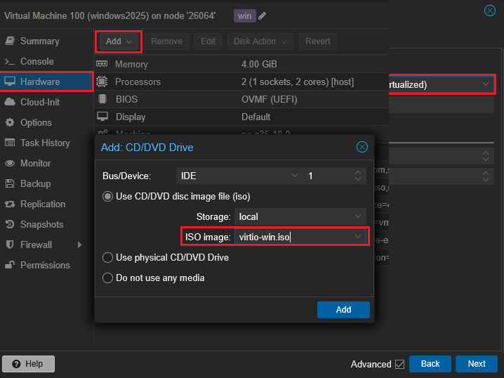- Проверьте Boot Order (Options → Boot Order) и что подключён верный ISO.