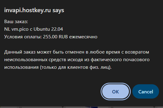 После нажатия на кнопку Заказать система проверит наличие сервера, средств на счете и отправит заказ на исполнение, сообщив номер назначенной машины. Во время исполнения заказа будут приходить сообщения о стадиях установки и как все будет готово - откроется диалог о готовности сервера. После оформления заказа система покажет информационное окно с деталями заказа и возможностью его отмены: