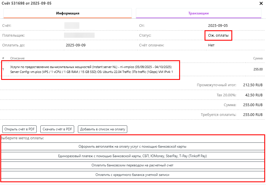 Если не подключена автоматическая оплата с баланса, то будет необходимо оплатить счет одним из следующих методов: