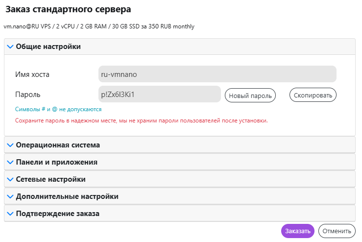 Для оформления заказа необходимо нажать кнопку Заказать. Процесс заказа сервера состоит из нескольких последовательных этапов.
