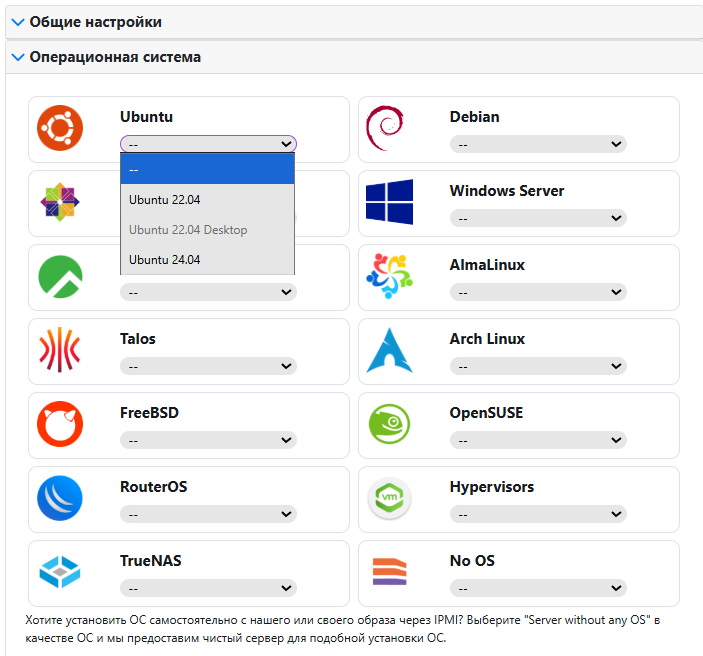 Для установки собственной ОС или ОС с нестандартной разбивкой дисков необходимо выбрать ОС Server without any OS - в этом случае будет проведена только зачистка дисков сервера и проведены все необходимые настройки порта доступа в Интернет.