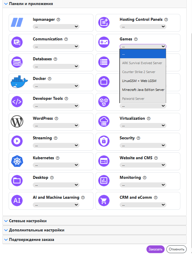 В этом разделе можно выбрать панель управления сервером или дополнительное программное обеспечение: