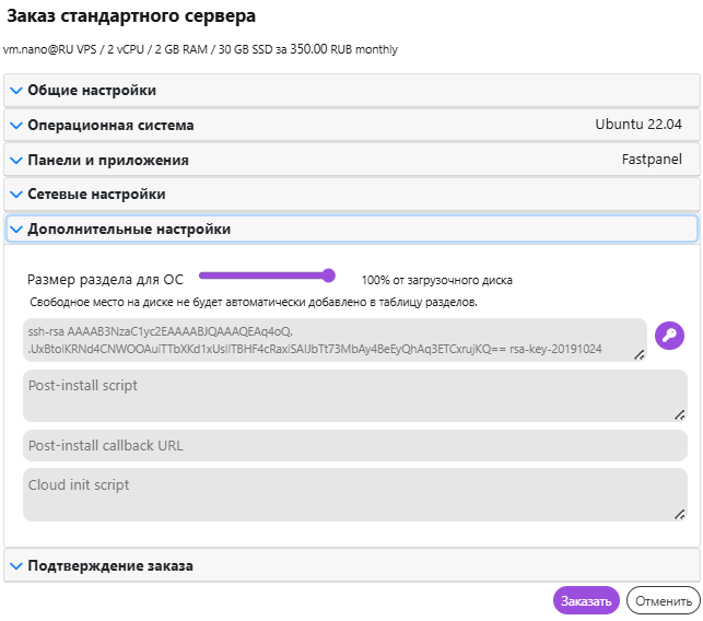 - SSH-ключ - публичный SSH-key супер-пользователя, который будет записан в ОС на пользователя root