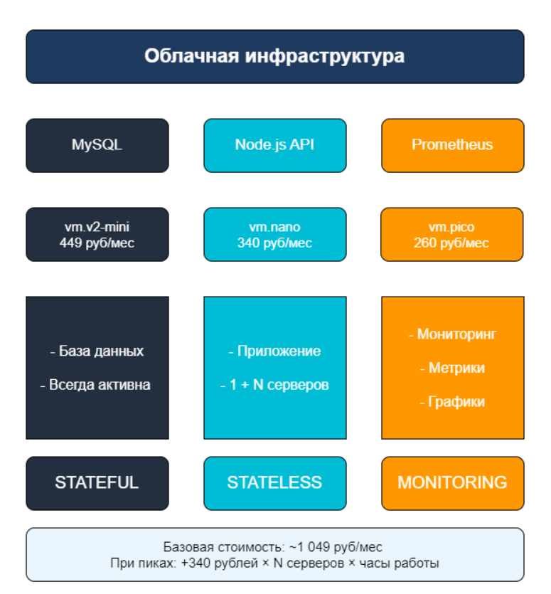 Мы намеренно использовали обычные VPS для демонстрации, потому что архитектура и принципы работы остаются теми же самыми, что и в полноценных облачных платформах. Код приложения, структура базы данных, настройка мониторинга — всё это идентично, независимо от того, развернули вы систему на VPS или в Yandex Cloud. Разница лишь в дополнительных возможностях, которые дает настоящее облако: автоматический автоскейлинг по метрикам, оплата строго за использованное время (а не месяц вперед), встроенные managed-сервисы и балансировщики нагрузки из коробки.