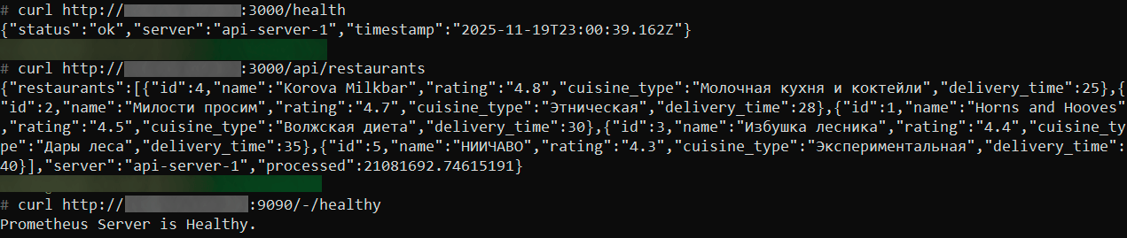 Это самый частый endpoint в реальном сценарии — пользователи открывают приложение и первым делом видят каталог заведений. Перед тестом убедились, что всё живое: API отвечает на health check, возвращает список ресторанов, а Prometheus показывает здоровый статус. Базовые проверки прошли — можно нагружать: