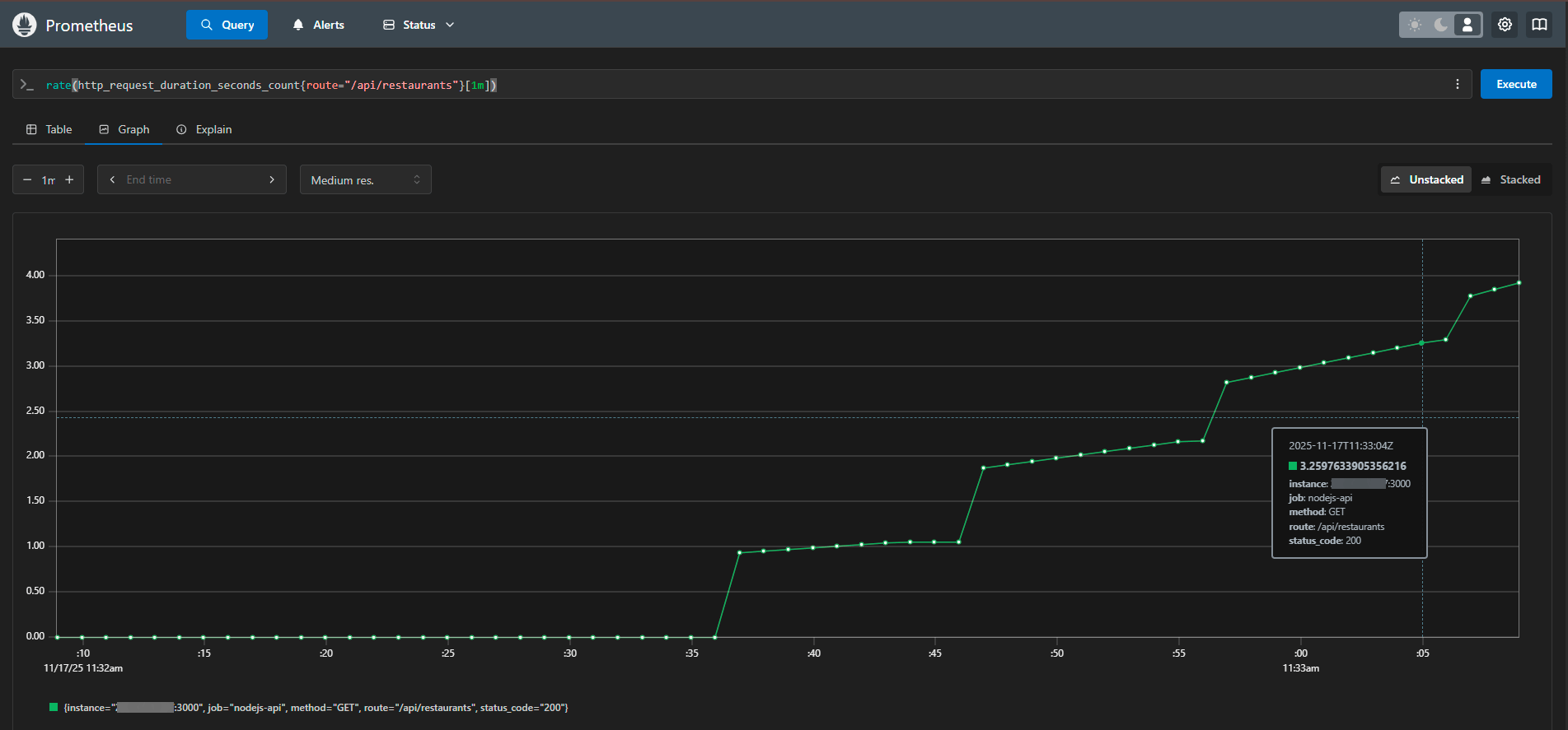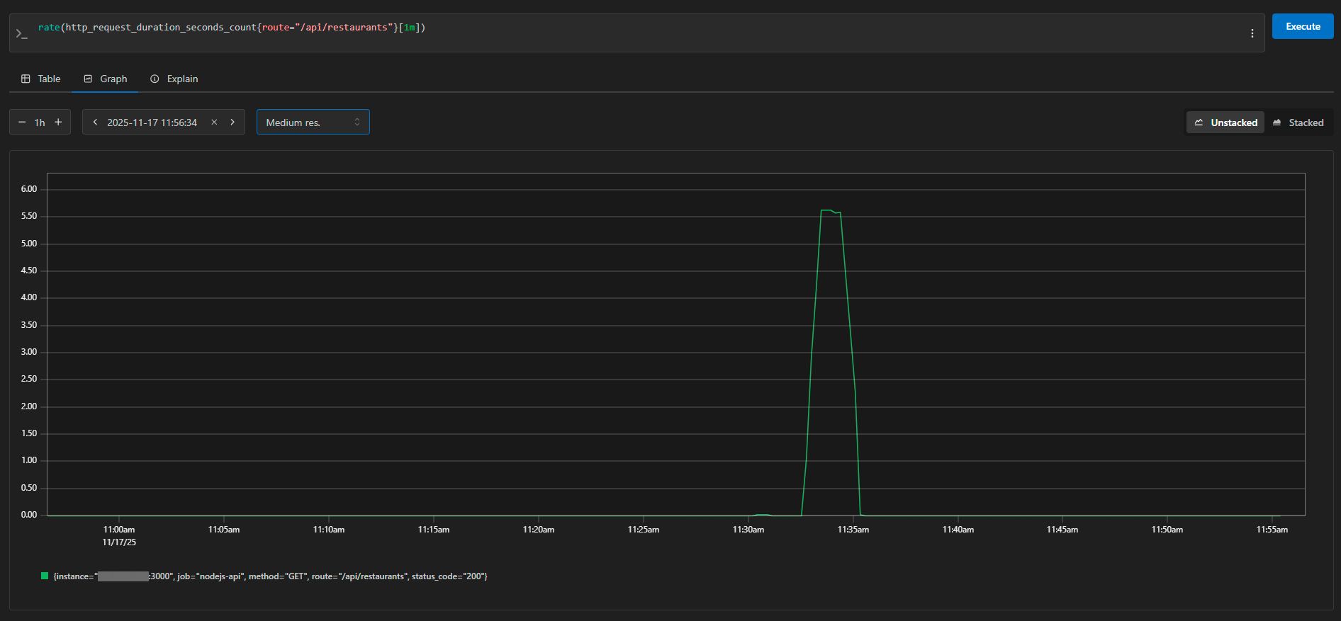 Тот же график с более узким временным окном показывает идеальный «колокол» нагрузки — от 0 до 5,5 RPS и обратно к нулю. Именно так выглядит контролируемый нагрузочный тест. В Prometheus видно каждый запрос: instance (адрес сервера), метод (GET), route (/api/restaurants), status_code (200). Метрики собираются каждые 10 секунд, поэтому график детализированный и точный: