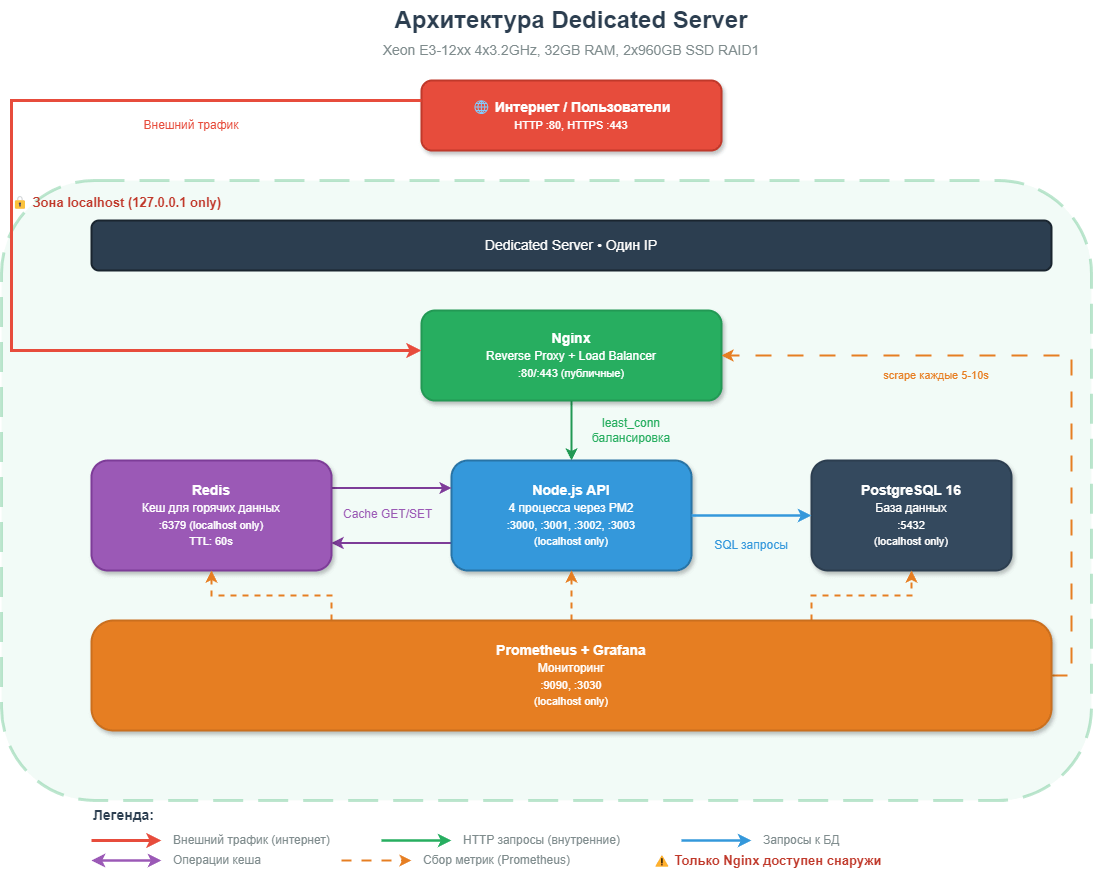 Nginx как reverse proxy — это отдельная история. Нужно настроить проксирование к четырем процессам Node.js, выбрать стратегию балансировки (least_conn в нашем случае), настроить таймауты, keepalive соединения, правильно передать заголовки. Если нужен SSL — добавь еще час на получение сертификатов через Let's Encrypt и настройку редиректов. И, наконец, Prometheus с Grafana — установка, конфигурация scrape targets для всех компонентов, создание базовых дашбордов для мониторинга. Еще час-два, но мониторинг и графики того стоят.