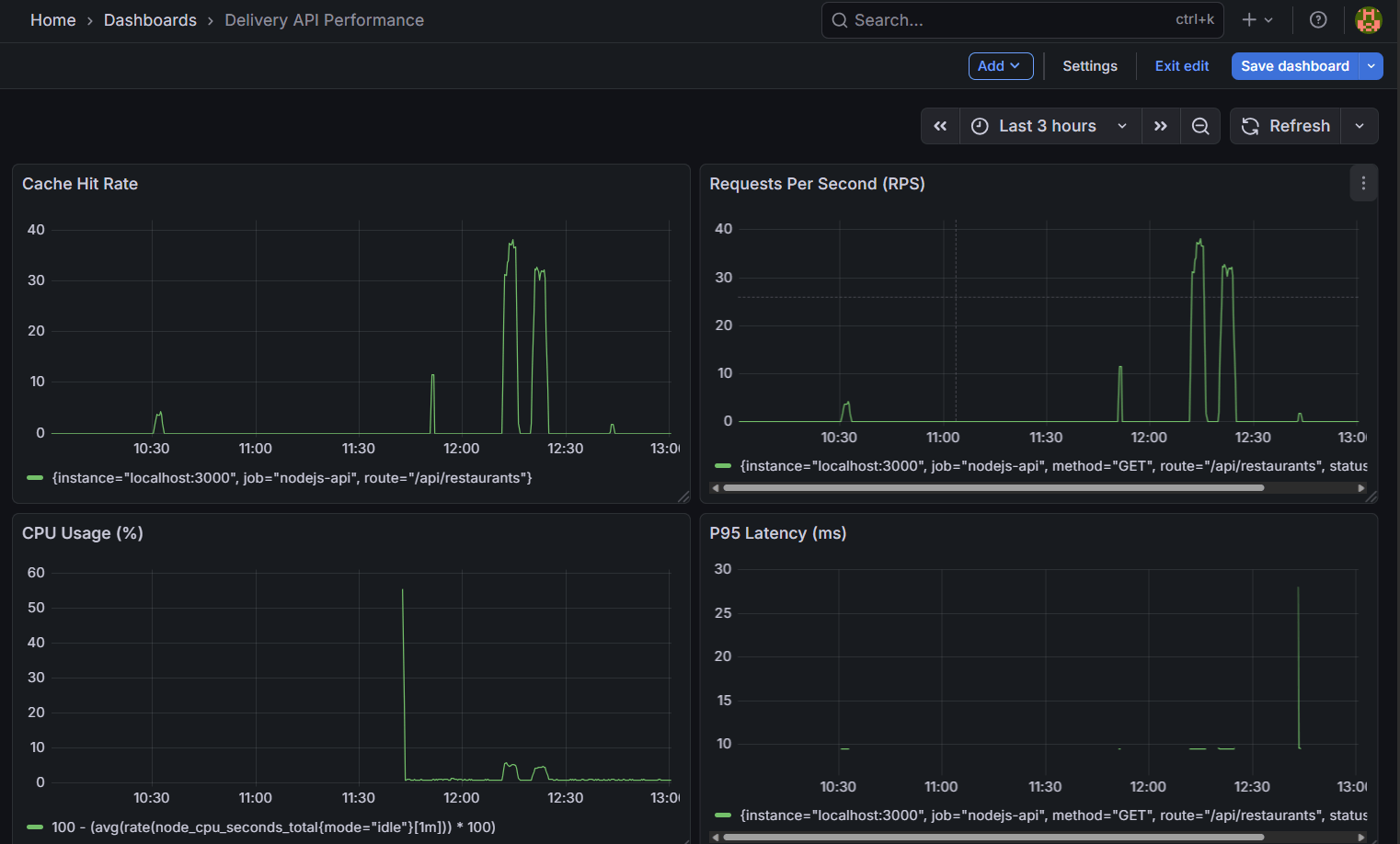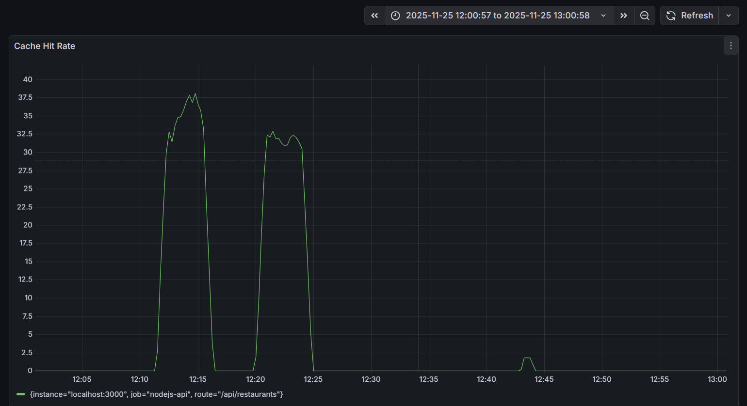Отдельного внимания заслуживает влияние Redis на производительность. График Cache Hit Rate за период тестирования показывает две четкие волны активности: