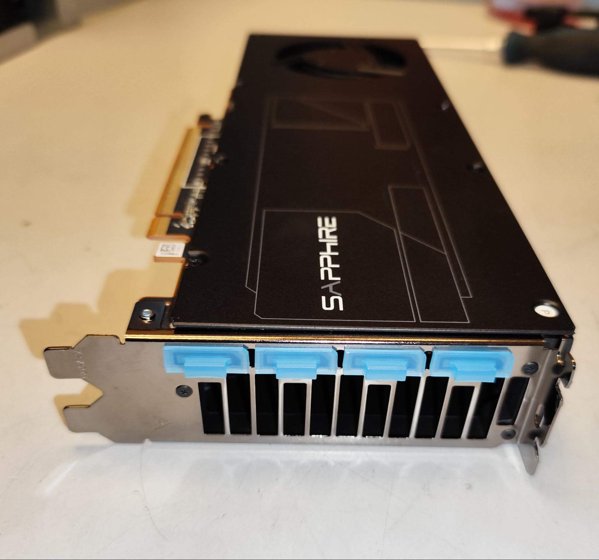 Как видно, карта двухслотовая с охлаждением из одного вентилятора (турбина), похожего на те, что делает для своих профессиональных GPU Nvidia.