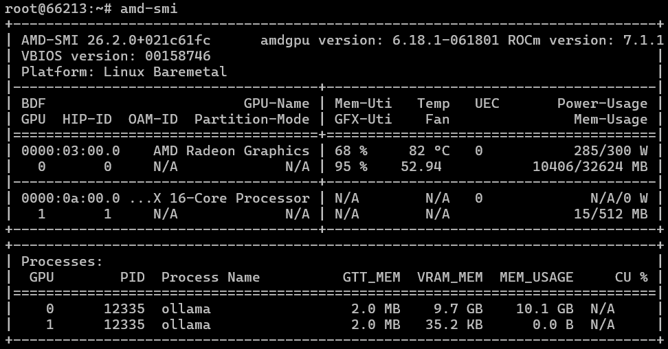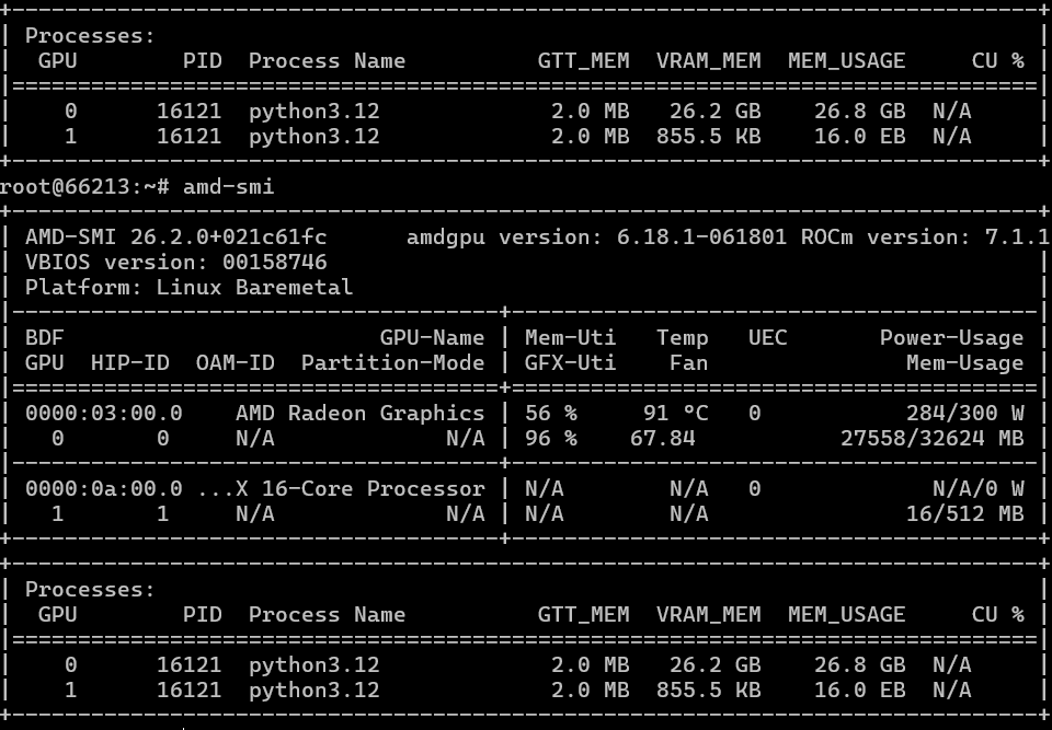 Если у вас (как и у нас) всё пройдет успешно, то команда amd-smi (ничего не напоминает?) выдаст вам похожие результаты. Первый скрин для EPYC’а (это видно по наличию второй AMD «встройки»), второй для i9. ROCm и там и там был 7.1.1.