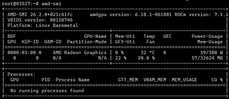По итогу мы запустили карту с ядром версии 6.18.2 (тестировали мы ее под конец прошлого года). И по традиции сделали инструкцию, как грамотно это сделать, и специальный скрипт установки (там же), который можно просто скопировать, вставить от root в командную строку, и он всё сделает за вас. Наша задача стоит запустить ROCm, но заодно мы поставили и протестировали карту в работе с 3D-рендерингом в HIP.
