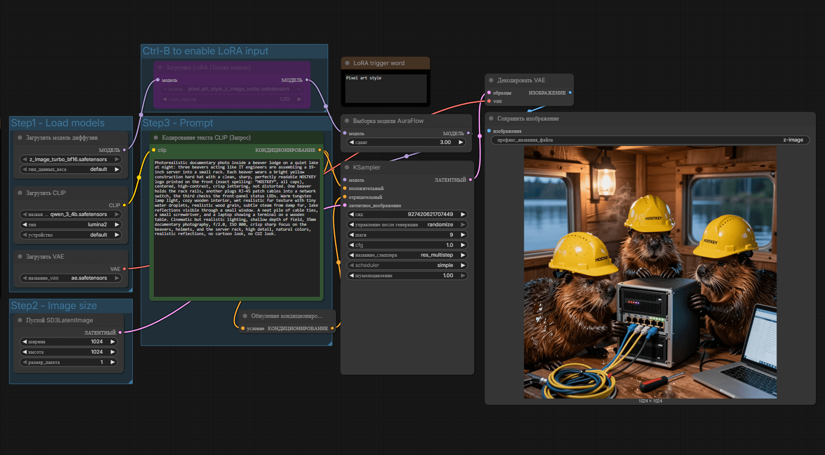 По нашей традиции тестирования попробуем рендер графики и видео в ComfyUI. Модель Z-image Turbo, разрешение 1024x1024, промт про бобров: