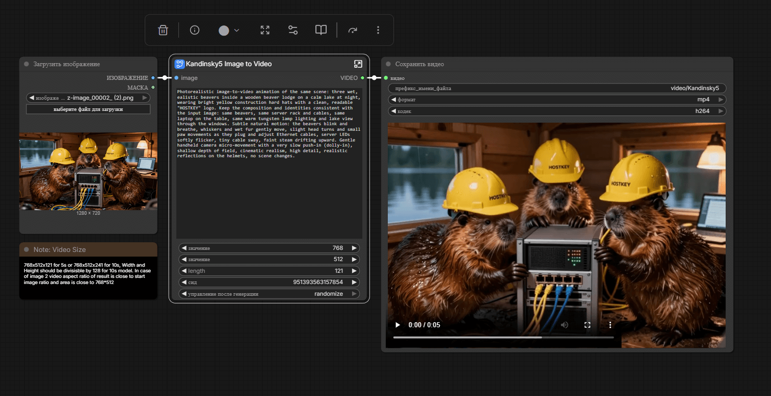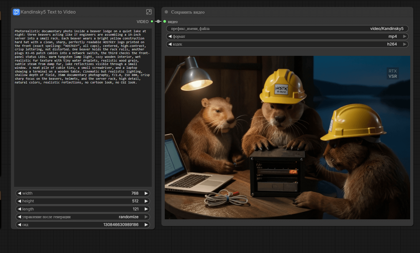 Kandinsky 5 Lite, режим «текст в видео» с тем же промтом. Этот режим карту нагружает по полной с потребляемой мощностью от 280 до 300 Ватт.