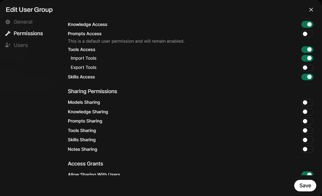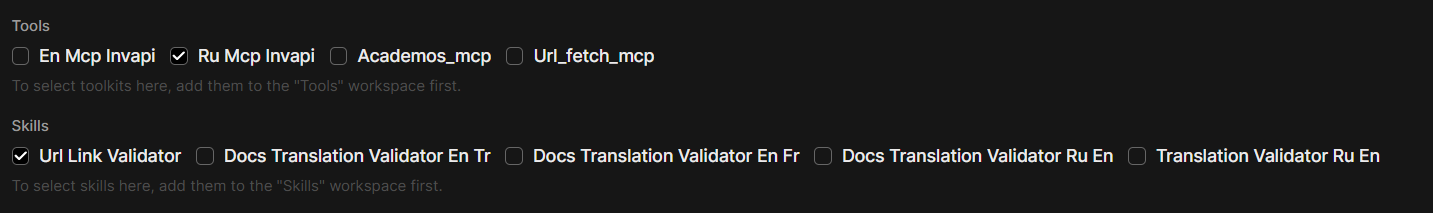 Обратите внимание на секцию между ---. В ней вы описываете ваш Skills и задаете, какие Tools он должен использовать. Также не забудьте включить Skills в настройках группы для ваших пользователей.