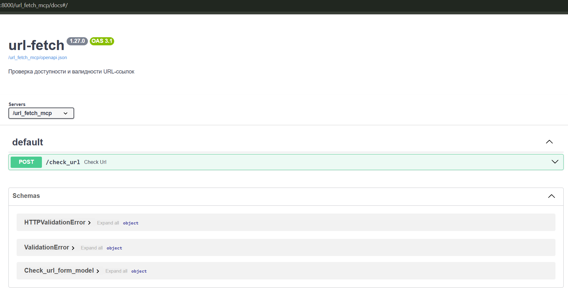 По факту сам инструмент — это простой fastmcp-сервер и код на питоне, который и проверяет ссылки. mcpo же в данном случае — это «переводчик» между миром локальных CLI-инструментов (MCP) и миром веб-приложений (OpenWebUI).