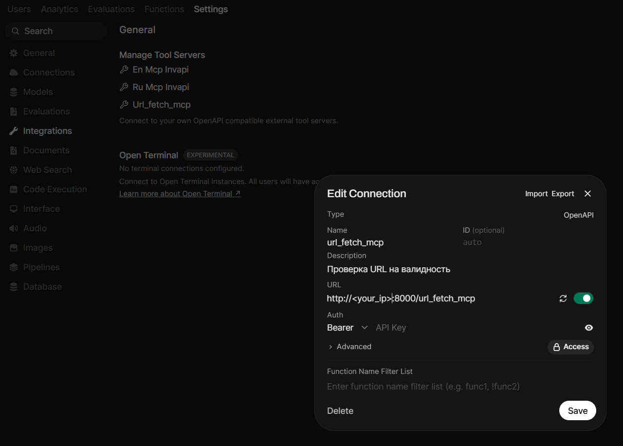 В нашем случае у нас есть уже специальный сервер mcpo (MCP over HTTP) от тех же разработчиков, на котором расположен инструментарий работы с Invapi, поэтому добавить туда еще один было не проблемой. Но никто не запрещает тот же код реализовать через внутренние Tools OpenWebUI.