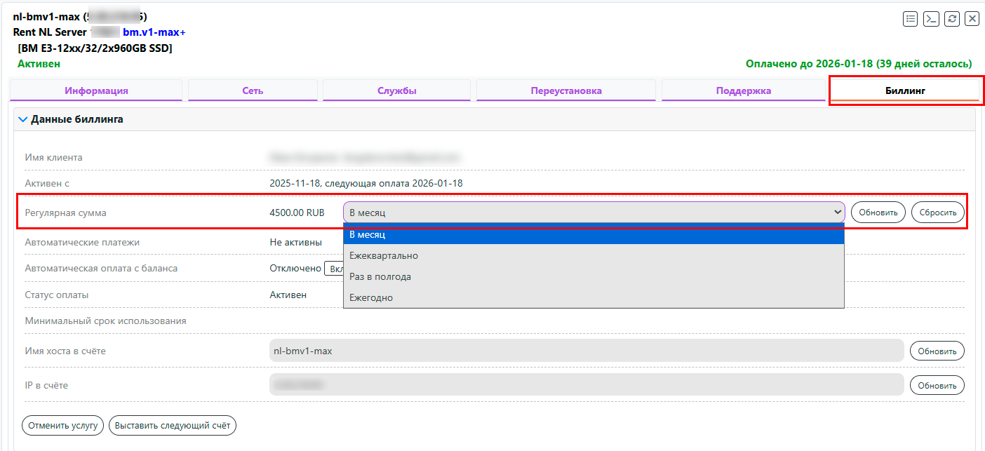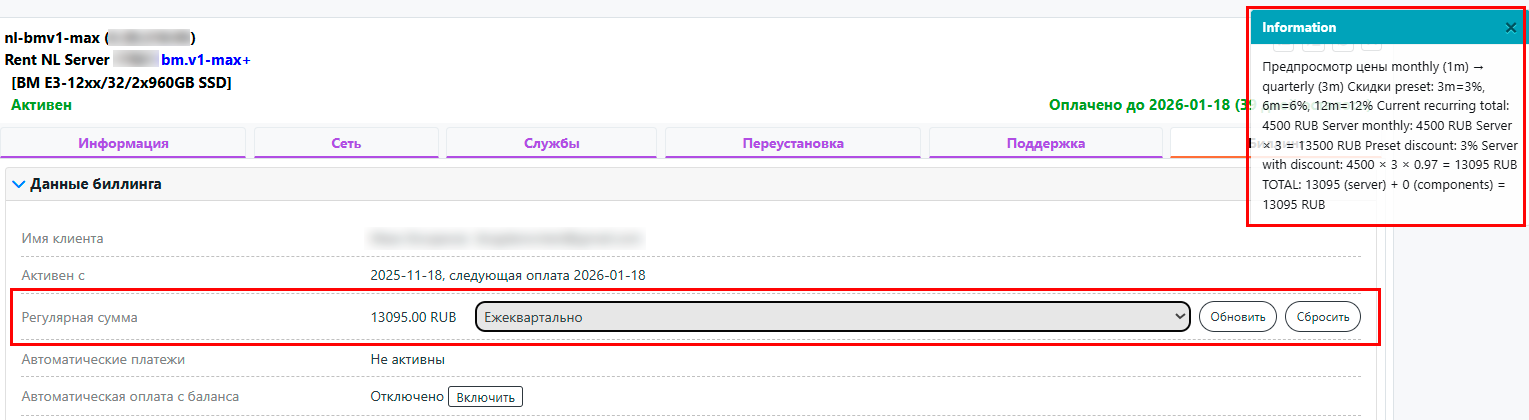 После подтверждения новый цикл оплаты будет применяться к последующим счетам за данный сервер.