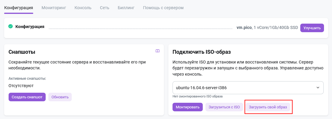 Перейти во вкладку Конфигурация >> **Монтировать ISO образ* и нажать на кнопку Загрузить свой образ: