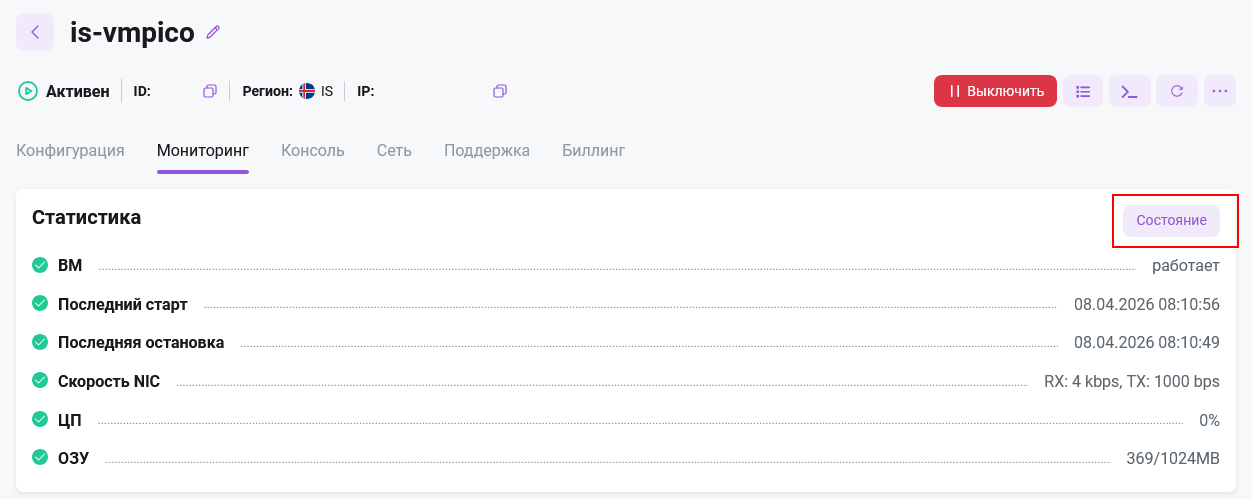 Вкладка Мониторинг карточки сервера позволяет наблюдать за состоянием вашего сервера.