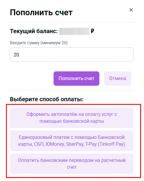 В этом меню пользователь необходимо указать сумму и метод оплаты: