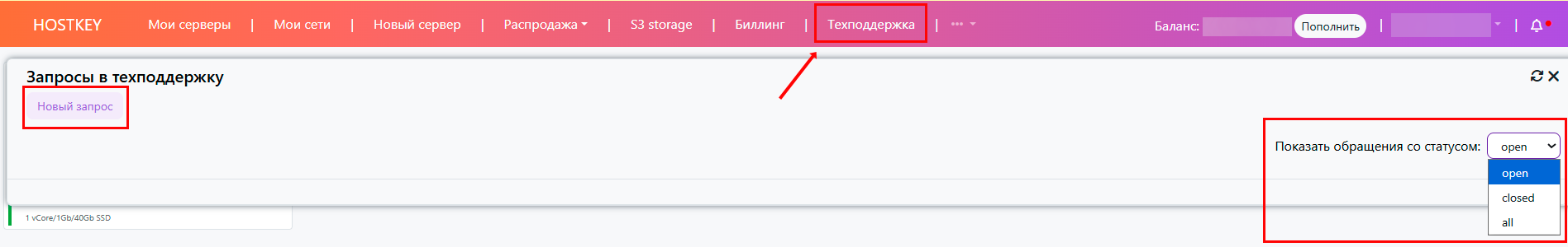 В верхней части страницы отображается список запросов в техподдержку. Для удобства работы предусмотрена фильтрация обращений по статусу: