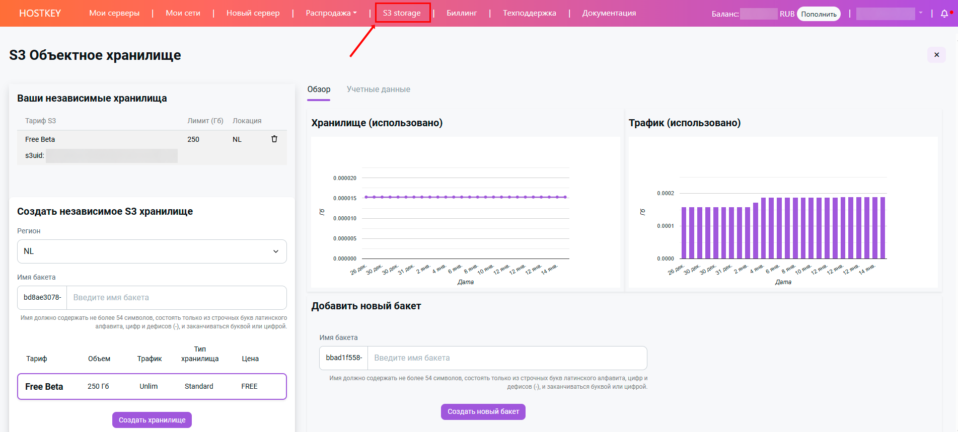 Этот пункт меню предназначен для управления объектным хранилищем S3. В данном разделе пользователь может создавать независимые S3-хранилища, управлять существующими, создавать и удалять бакеты, а также отслеживать текущее потребление ресурсов.