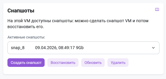 - Активные снапшоты - просмотр существующих снапшотов в раскрывающемся списке;