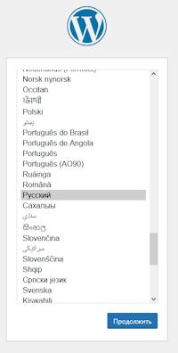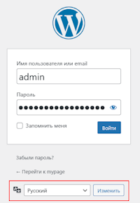 - После установки Wordpress необходимо повторно ввести Логин и Пароль администратора. В данном окне вы также можете повторно выбрать язык работы приложения. Нажмите
