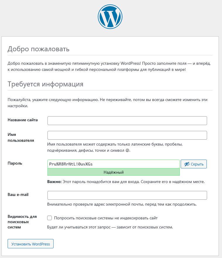 - В открывшемся окне задайте основные параметры сайта и настройки учетной записи администратора (требования к имени пользователя и паролю указаны под соответствующими полями).