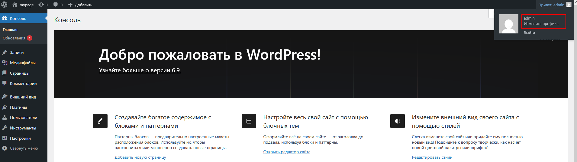 - В открывшемся окне вы можете продолжать работу со своей страницей. Для того, чтобы изменить учетные данные администратора, нажмите на профиль в верхней части странице и выберите меню Изменить профиль.