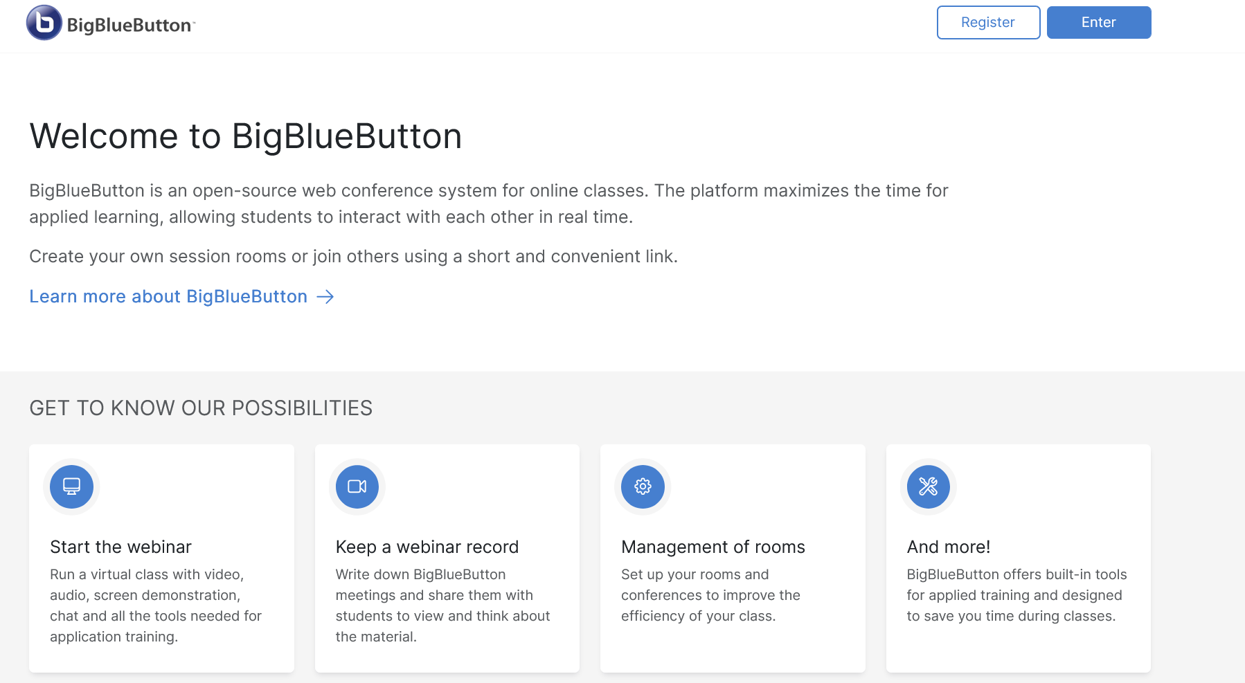 Подробная информация по основным настройкам BigBlueButton содержится в документации разработчиков.