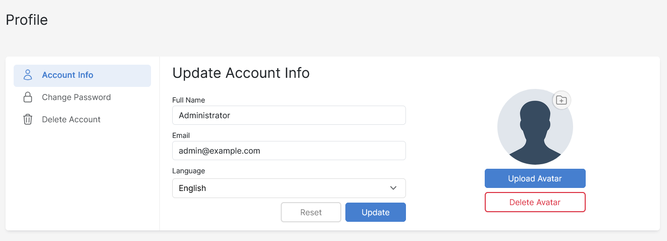 В этом меню вы можете управлять настройками учетной записи Администратора: