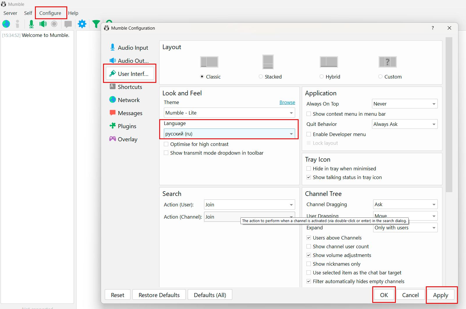 Интерфейс Mumble по умолчанию на английском языке. Для изменения настроек языка:
