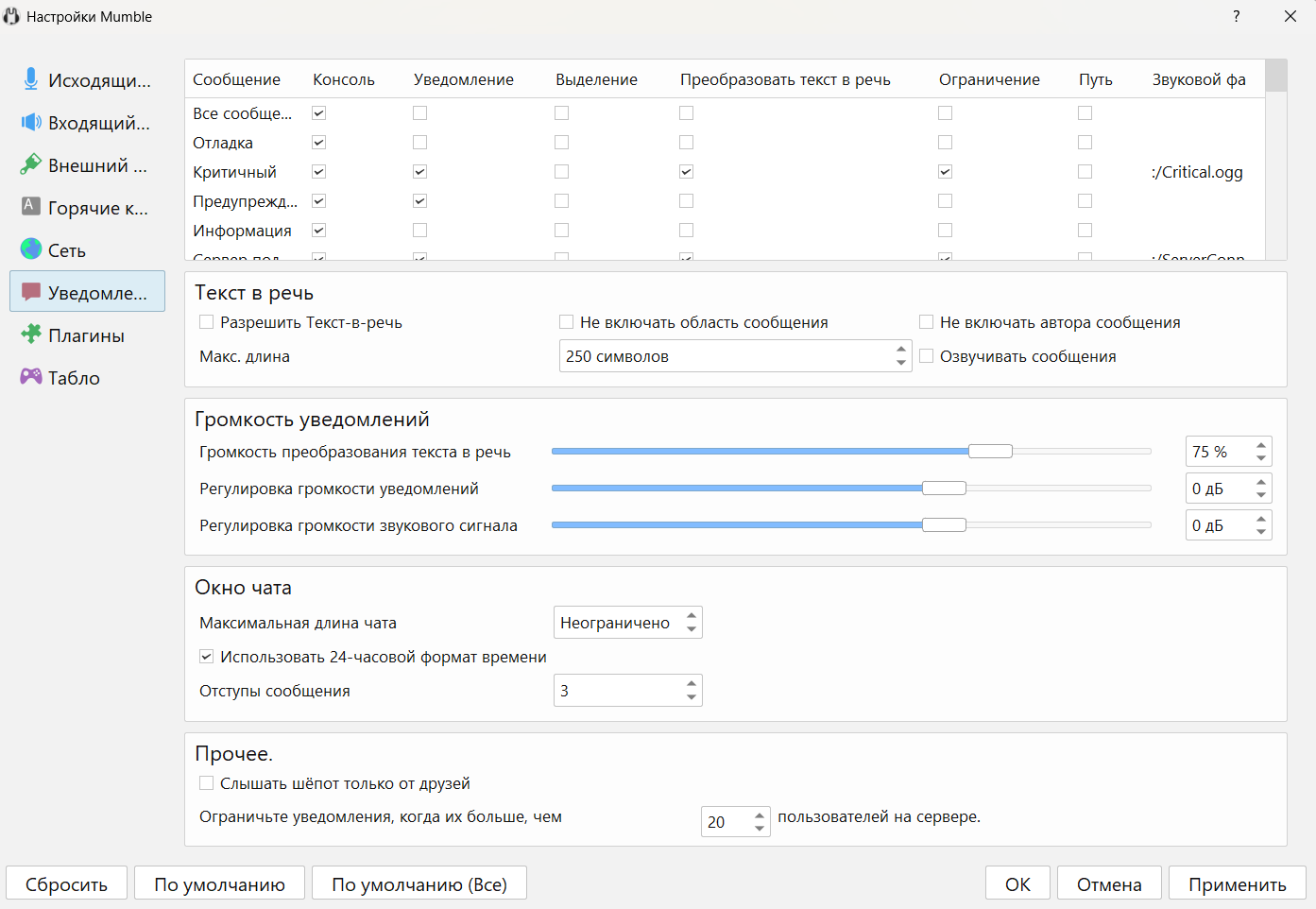Подробная информация по основным настройкам Mumble содержится в документации разработчиков.
