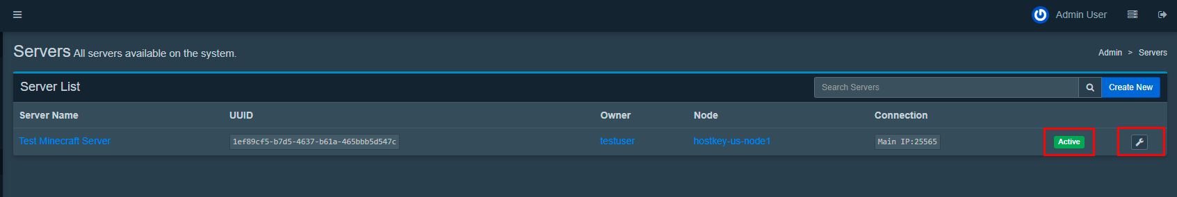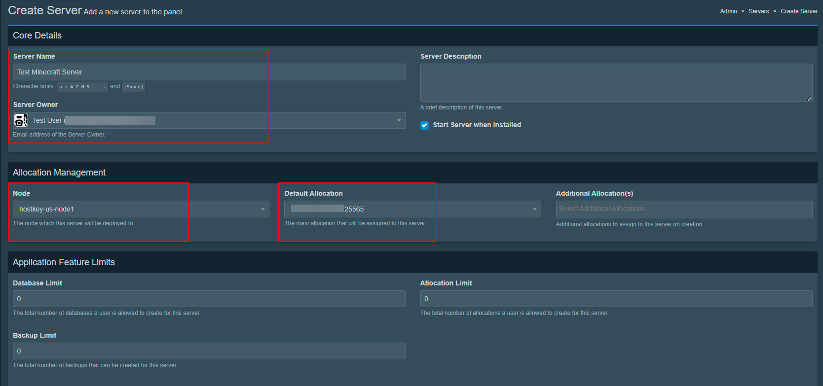 Test Minecraft Server); - Server Owner: выберите пользователя-владельца из списка;
