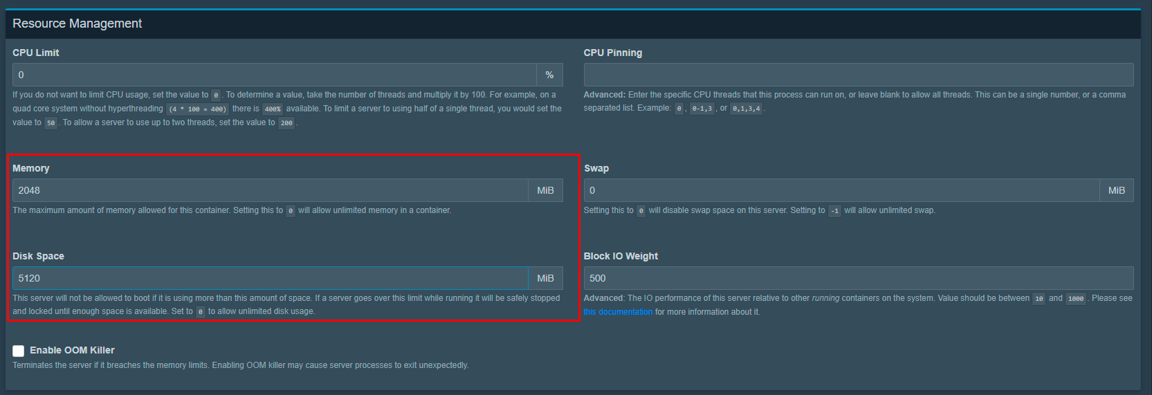 500; - Enable OOM Killer: оставьте выключенным.
