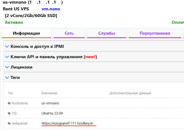 Данные для последующего входа по защищенному домену после первичной настройки можно найти или во вкладке Информация >> Тэги в панели управления серверами и API — Invapi.