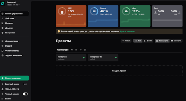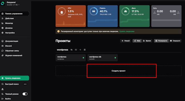 Основным преимуществом EasyPanel является максимально простая и быстрая процедура развертывания проектов.