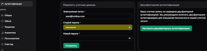 - Вкладка Аутентификация -здесь вы можете изменить пароль Администратора панели и настроить двухфакторную авторизацию (рекомендуется)