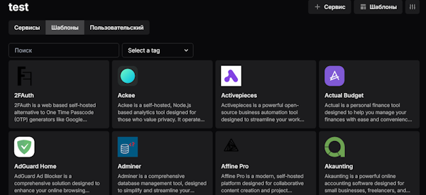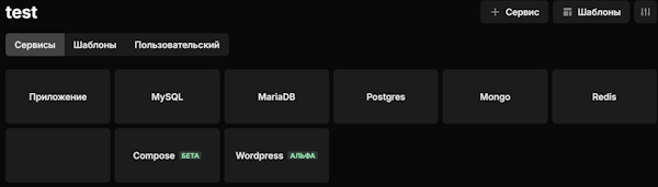 - Готовые шаблоны для развёртывания: WordPress, Laravel, Node.js, Next.js, Nuxt, Django, и др.