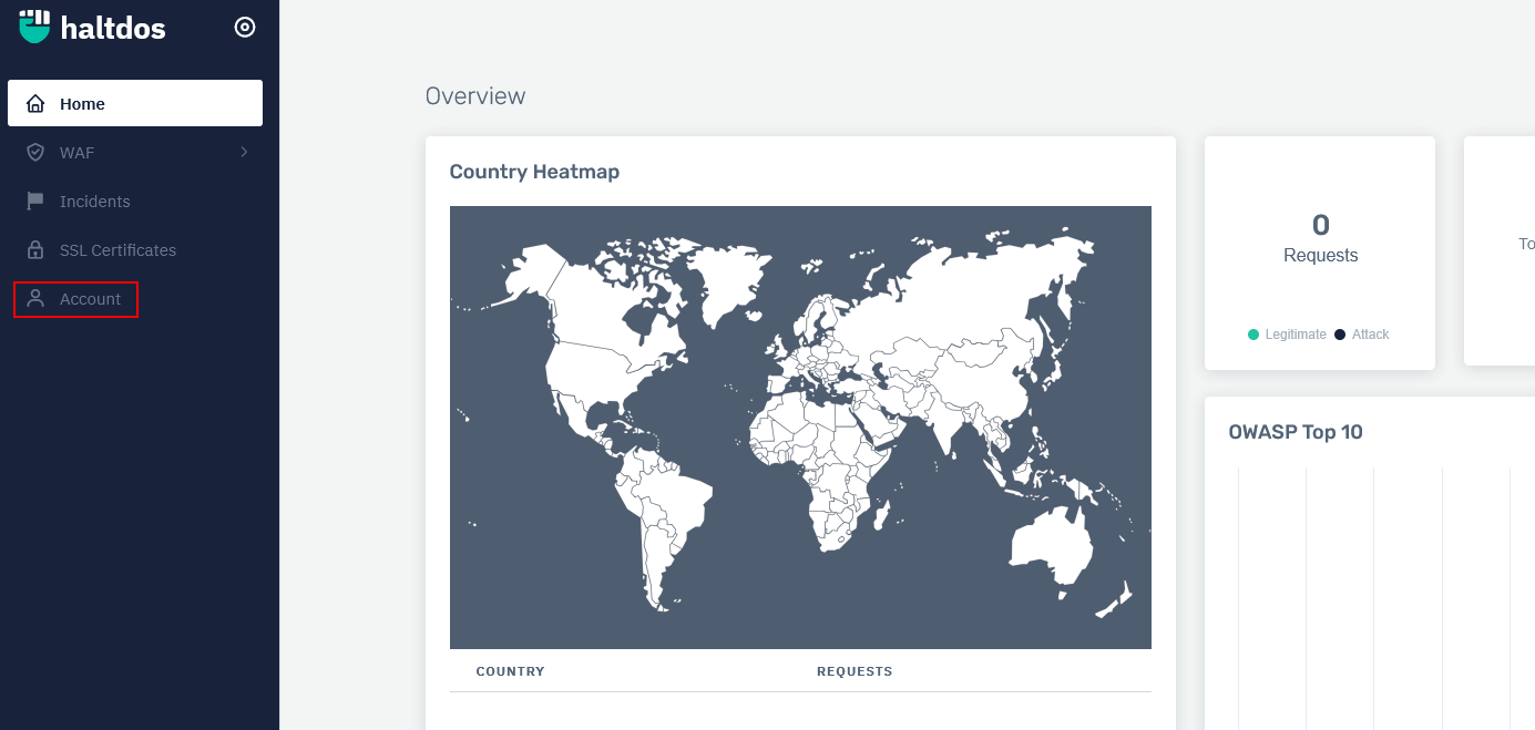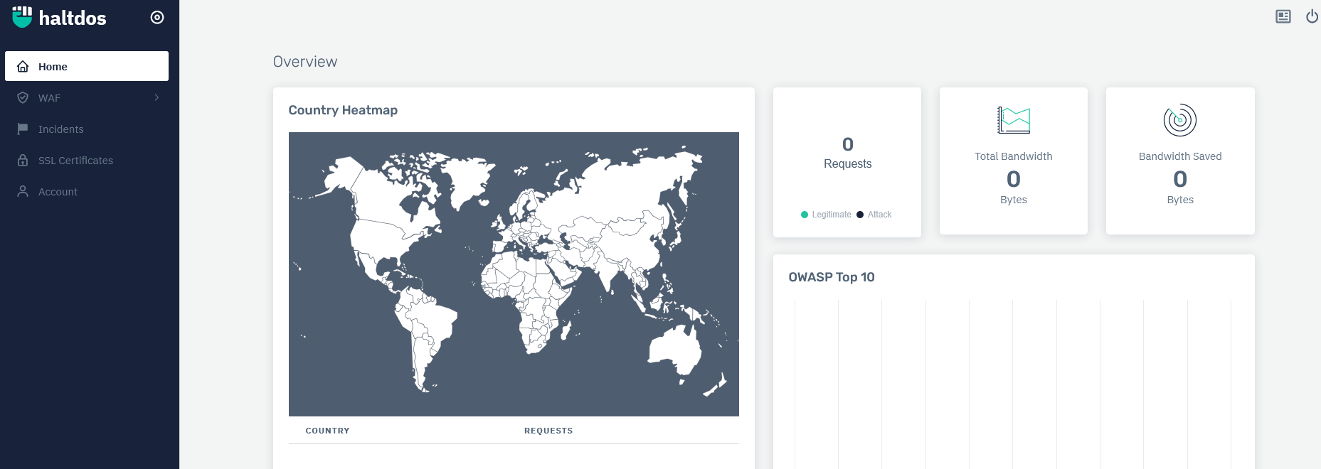 После успешной авторизации вы попадете на стартовый экран Haltdos Community WAF, предоставляющий обзор состояния системы безопасности: