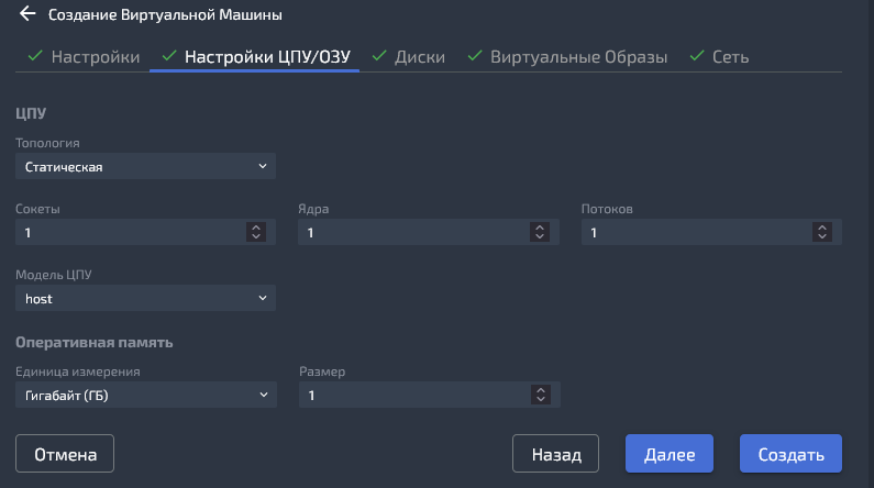 Во вкладке Настройки ЦПУ/ОЗУ настройте ЦПУ и оперативную память.