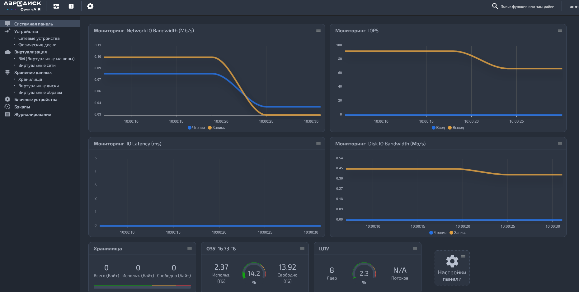 После успешной авторизации вы попадете на стартовый экран OpenVair, предоставляющий обзор состояния системы (Мониторинг параметров, состояние хранилищ, ОЗУ и ЦПУ):