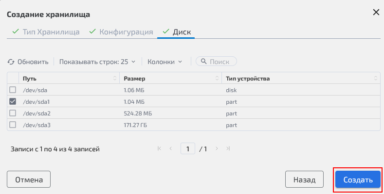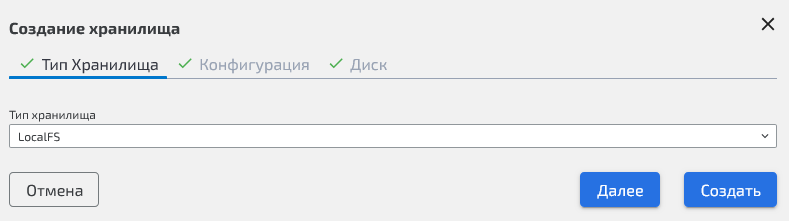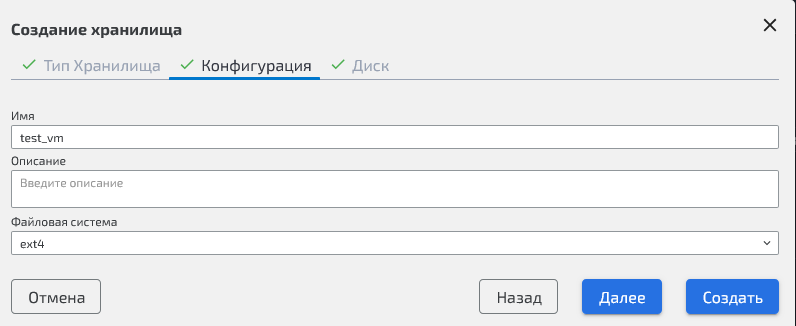 Для начала необходимо создать в разделе Хранилища хранилище для развертывания виртуальной машины (например партицию на локальном диске)